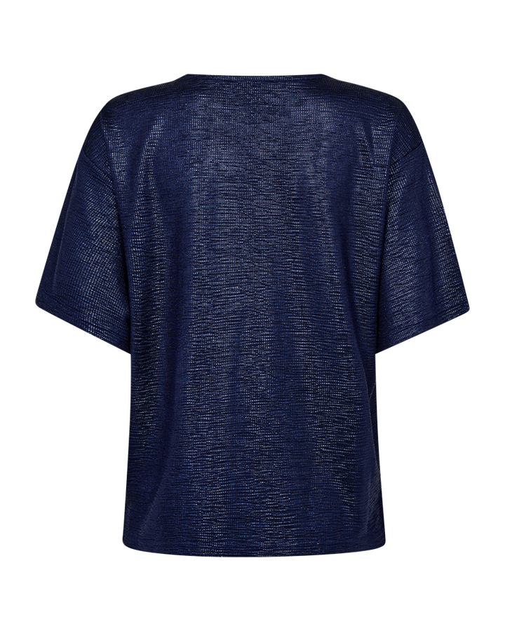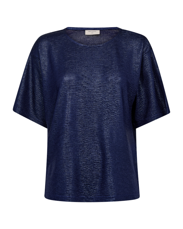 Comfort ontmoet sparkle. Dit donkerblauwe T-shirt van Freequent heeft een luchtige, rechte snit en een subtiele metallic glans die je outfit meteen een feestelijke twist geeft. De soepele stof voelt zacht aan en valt mooi losjes rond het lichaam, ideaal voor zowel casual als geklede looks.