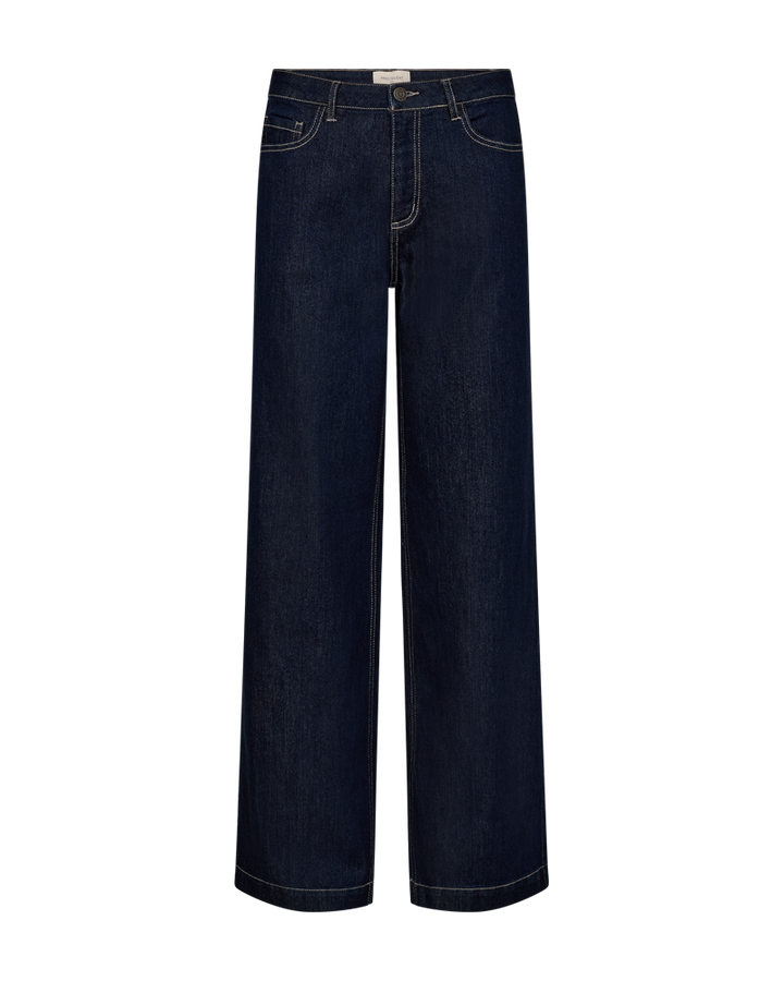 - Donkerblauwe jeans met wijde, rechte pijpen