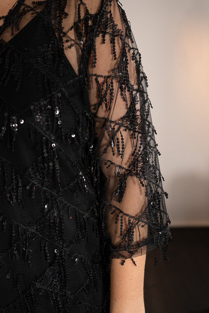 Feestelijke jurk van Freequent afgewerkt met glitters. De jurk valt tot aan de knie. Er wordt een onderjurk bijgeleverd.