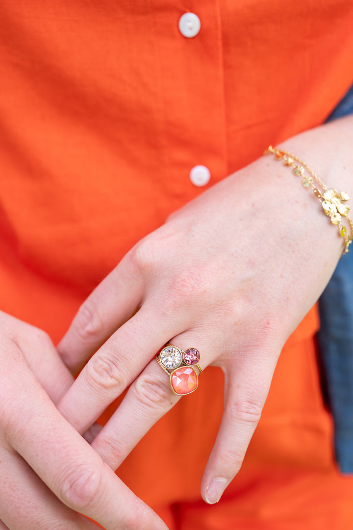 Deze verfijnde ring in goudkleur is bezet met drie sprankelende Swarovski-kristallen in verschillende formaten en kleurtinten. De speelse, asymmetrische opstelling geeft deze ring een moderne maar elegante uitstraling. Perfect om je outfit een frisse, kleurrijke touch te geven.
